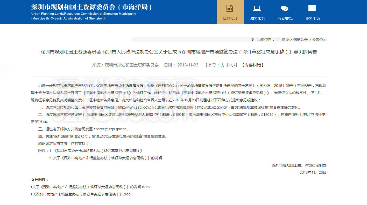 據(jù)了解,深圳市規(guī)土委會同市法制辦聯(lián)合開展了《深圳市房地產(chǎn)市場監(jiān)管辦法》的修訂工作,形成《深圳市房地產(chǎn)市場監(jiān)管辦法(修訂草案征求意見稿)》(以下簡稱《辦法意見稿》)。記者注意到,此次修訂的大背景是落實(shí)國家“房住不炒”的目標(biāo)要求,加上國務(wù)院取消了房地產(chǎn)經(jīng)紀(jì)人資格管理制度、深圳市取消了房地產(chǎn)行業(yè)年檢制度而實(shí)行年報(bào)制度,原監(jiān)管辦法自2010年以來,已實(shí)施近8年,相關(guān)規(guī)定已不合時(shí)宜,亟需結(jié)合新的形勢和要求進(jìn)行修訂完善。