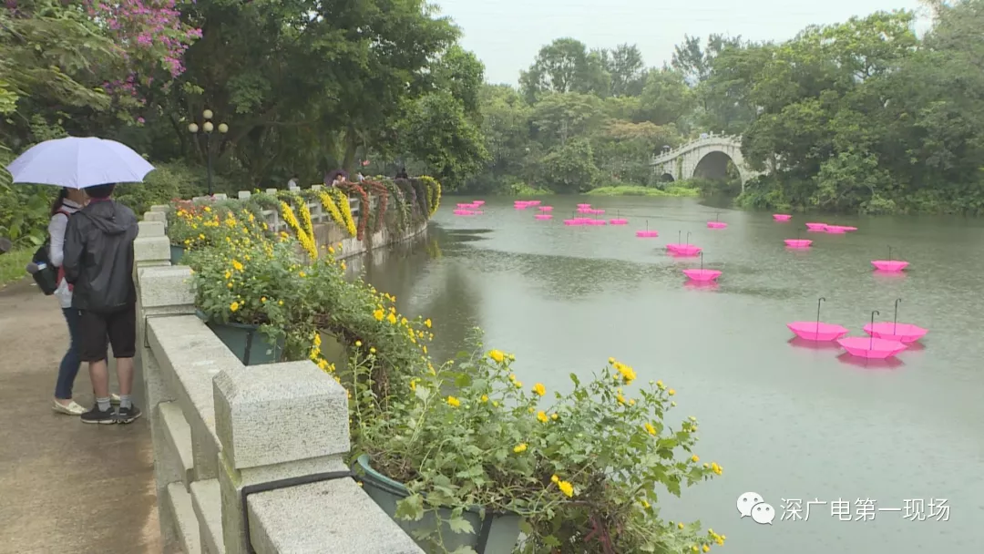 為了讓市民感受到這種小別重逢的驚喜,公園方面準(zhǔn)備了很多新的創(chuàng)意,在沿湖步道布置了400盆懸崖菊,像孔雀尾羽一般垂向水面,湖面上三三兩兩漂浮著粉紅色的雨傘,在雨絲中倒映著湖光山色,別有一番詩(shī)情畫意。