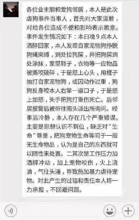 當天深夜,男子在業(yè)主群中道歉,稱自己晚上9點醉酒回家,發(fā)現(xiàn)自家寵物狗掙脫狗鏈,到處拉屎還將家里的鞋子、衣物撕咬破碎,抽打自家寵物狗時,又被反咬一口,才會失手將狗打成重傷,同時男子表示“對此產(chǎn)生的過錯和責任本人將一力承擔,不回避問題。”
