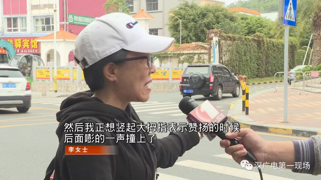 正當(dāng);李女士要贊揚(yáng)他時,這輛小汽車被后面的電動車追尾了