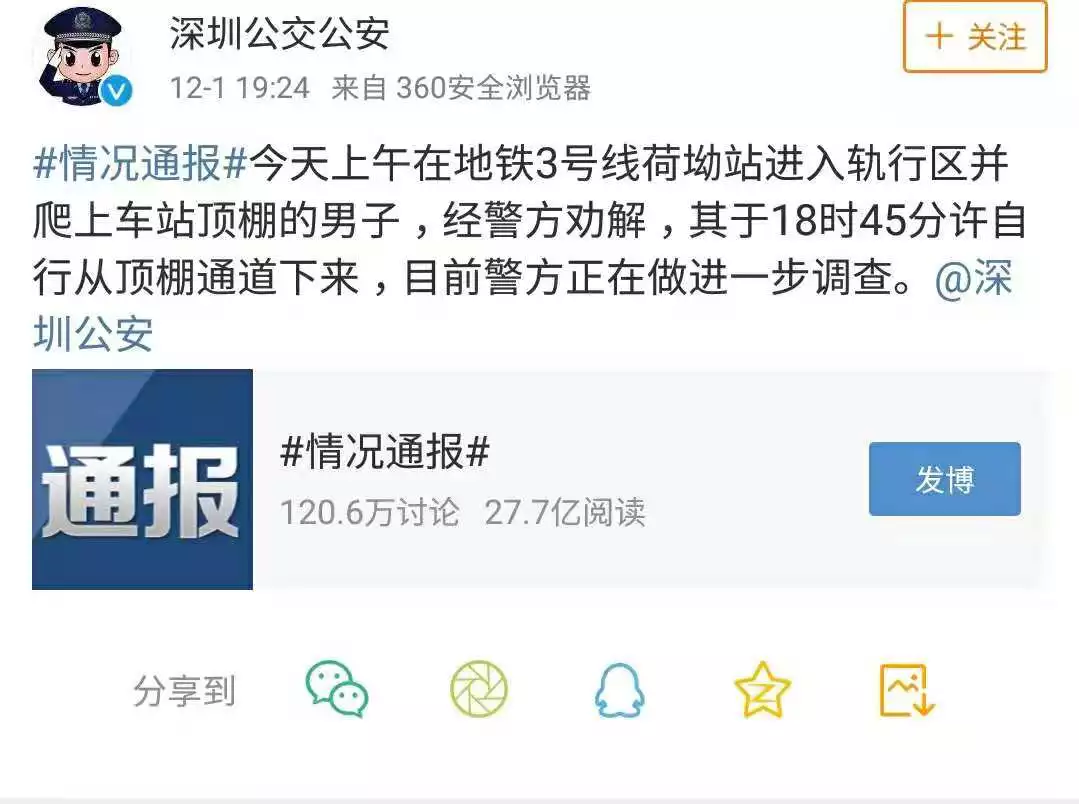 @深圳公交公安19點(diǎn)24分發(fā)布的消息,經(jīng)過深圳警方的勸解,男子自行從頂棚通道下來(lái),目前警方正在做進(jìn)一步調(diào)查。