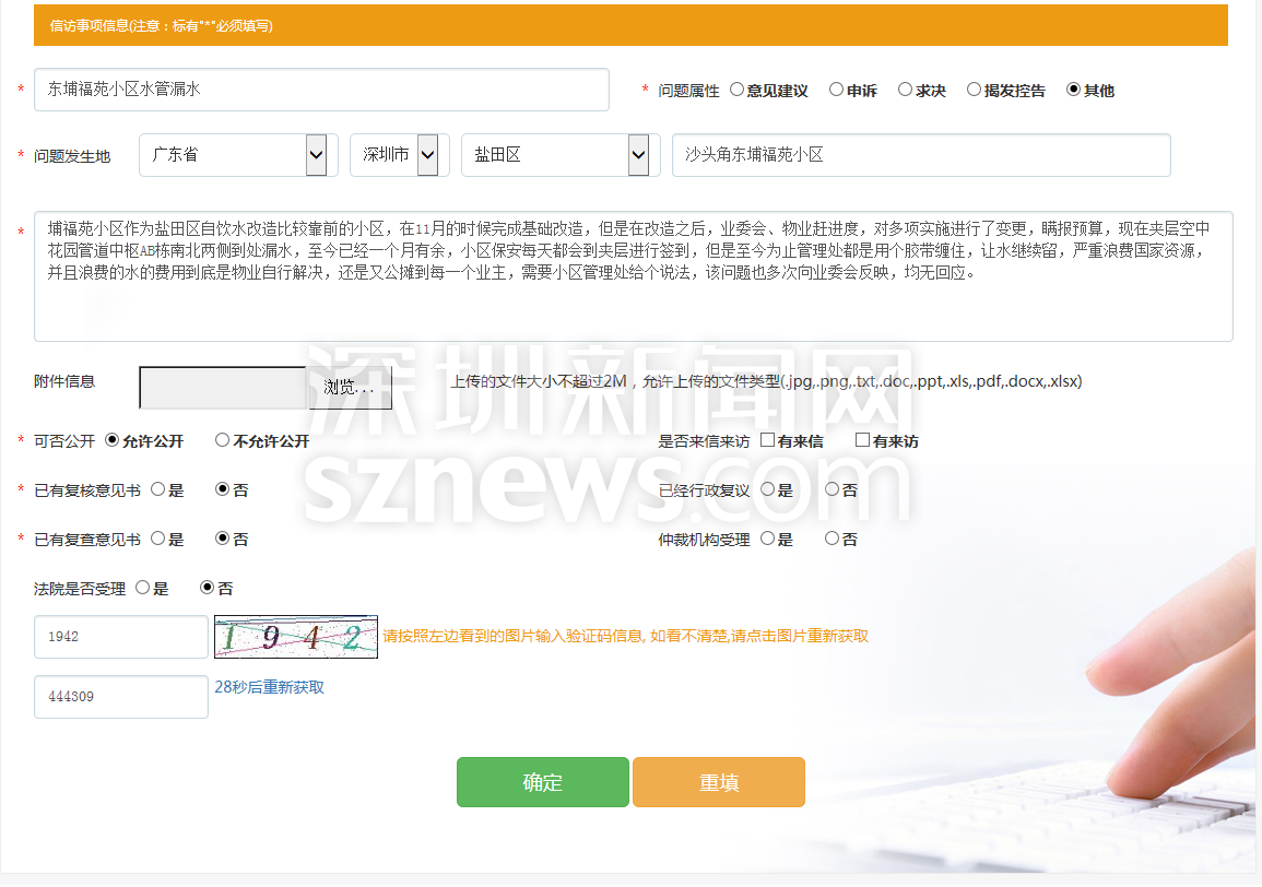 為核實(shí)網(wǎng)友反映情況,記者隨即登錄該網(wǎng)站,點(diǎn)擊“我要寫(xiě)信”后,便跳轉(zhuǎn)到寫(xiě)信填表頁(yè)面,填寫(xiě)完基本信息,點(diǎn)擊確認(rèn),顯示“投信成功”。經(jīng)測(cè)試,記者并未看到該網(wǎng)友反映的“添加失敗”情況。但從網(wǎng)帖上看,該網(wǎng)友仍對(duì)自己投訴無(wú)門(mén)的遭遇感到糟心,他堅(jiān)持表示自己手上有水管漏水以來(lái)近一個(gè)月的照片和視頻,自己反映的情況也絕對(duì)屬實(shí),希望有關(guān)部門(mén)能給一個(gè)答復(fù)。