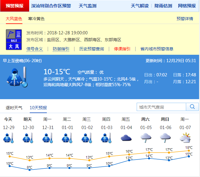 深圳新聞網(wǎng)2018年12月29日訊(記者 陳婕)深圳市氣象局預(yù)計(jì),29日-元月3日受冷空氣持續(xù)影響,氣溫顯著下降,天氣持續(xù)寒冷,最低氣溫將降至7-8℃,沿海和高地有7-9級偏北大風(fēng),間中有小雨。寒冷天氣將持續(xù)6天左右。