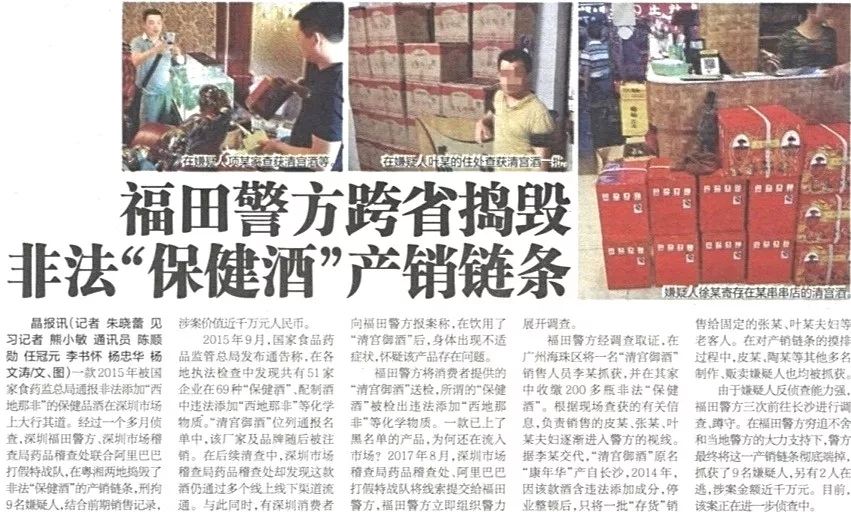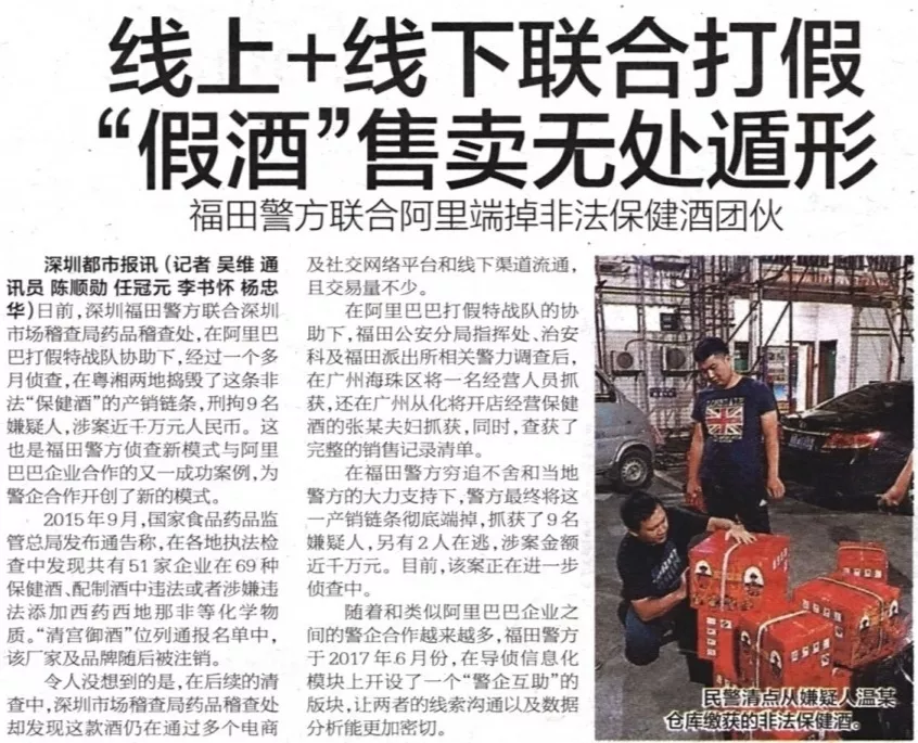 ★★福田警方聯(lián)合深圳市場稽查局藥品稽查處,在阿里巴巴“打假特戰(zhàn)隊(duì)”協(xié)助下,經(jīng)過一個(gè)多月偵查,于粵湘兩地?fù)v毀了非法“保健酒”的產(chǎn)銷鏈條,刑拘9名嫌疑人,涉案價(jià)值近千萬元人民幣。