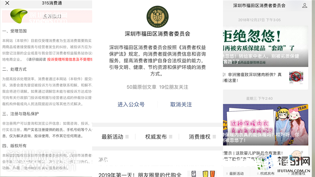 福田區(qū)消委會微信公眾號界面,包含消費維權投訴、發(fā)布消費警示等內(nèi)容。