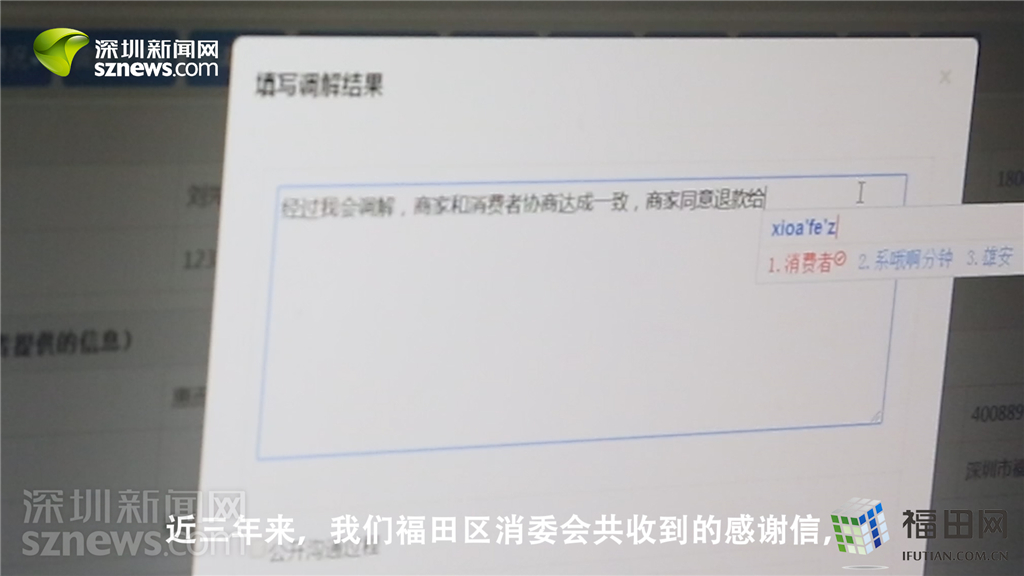 福田區(qū)消委會工作人員在315投訴平臺上填寫調解結果。