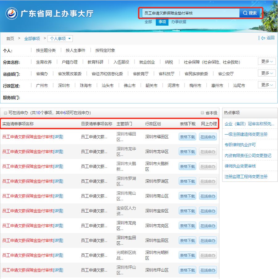 答:員工登錄廣東省網(wǎng)上辦事大廳官網(wǎng),點(diǎn)擊“個(gè)人事項(xiàng)”,在搜索欄中輸入“員工申請(qǐng)欠薪保障金墊付審核”,可查詢到各區(qū)“員工申請(qǐng)欠薪保障金墊付審核”事項(xiàng),選擇所在區(qū)點(diǎn)擊“詳情”,即可查詢到所在區(qū)人力資源部門的咨詢電話、辦理地址、辦理時(shí)間和交通指引等相關(guān)信息。
