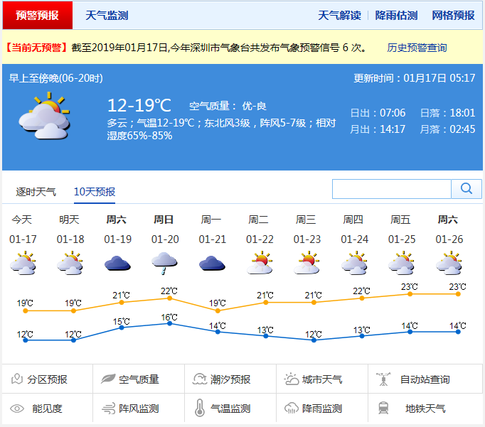 深圳新聞網2019年1月17日訊(記者 劉婷)受冷空氣和切變線影響,深圳1月16日陰天有小雨,天氣明顯轉涼。今日白天,陰天轉多云可見陽光。早晚最低氣溫徘徊在12 ℃左右,中午前后最高氣溫在19 ℃左右,早晚較冷,注意添衣保暖。
