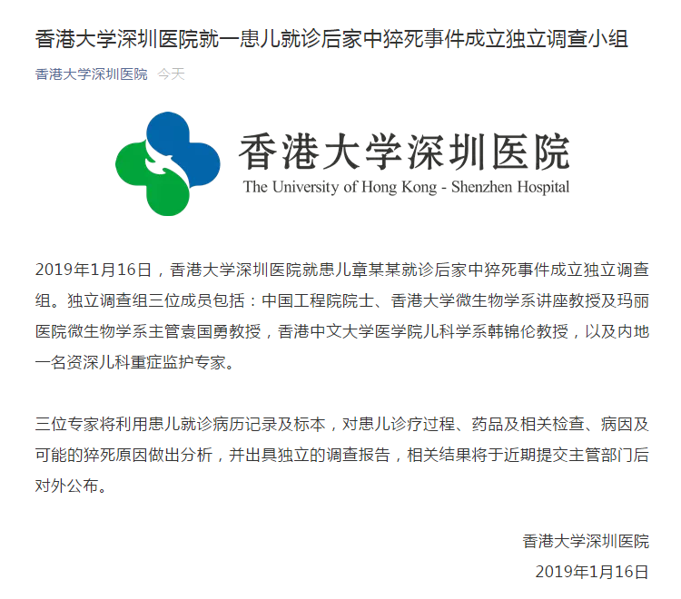1月16日,香港大學深圳醫(yī)院就患兒章某某就診后家中猝死事件成立獨立調(diào)查組,待調(diào)查完畢后將把相關結(jié)果提交主管部門并對外公布。