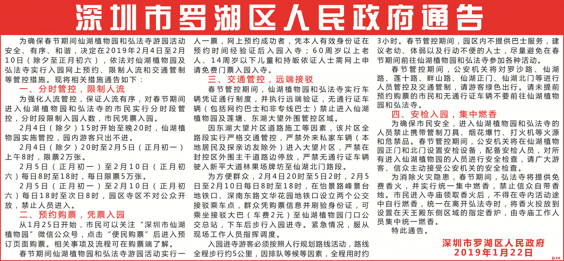 為確保春節(jié)期間仙湖植物園和弘法寺游園活動安全、有序、和諧,決定在2019年2月4日至2月10日(除夕至正月初六),依法對仙湖植物園及弘法寺實行入園網(wǎng)上預(yù)約、限制人流和交通管制等管控措施。現(xiàn)將相關(guān)措施通告如下: