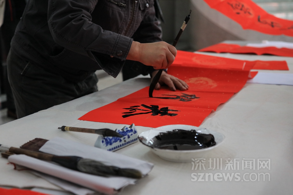 過年貼春聯(lián),是中華民族的傳統(tǒng)習(xí)俗之一。可以說,春聯(lián)一出,年味十足。記者在深圳商報大廈一樓活動現(xiàn)場看到,工作人員早已準備好了春聯(lián)的紅紙和筆墨,多位書法了得的記者編輯揮毫潑墨,創(chuàng)作出了一幅幅寓意喜慶吉祥的對聯(lián),并免費贈送給同事。不少人為了能拿到新鮮出爐的春聯(lián),提前在現(xiàn)場排隊等候。