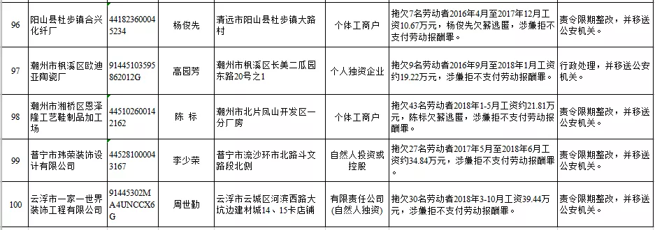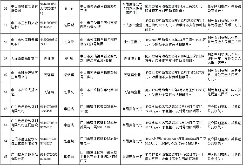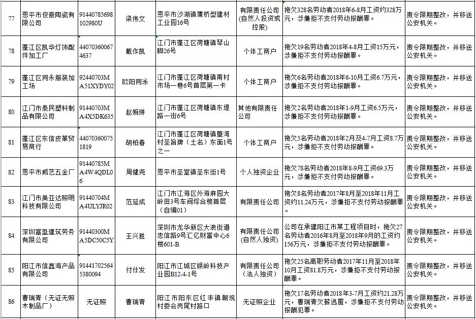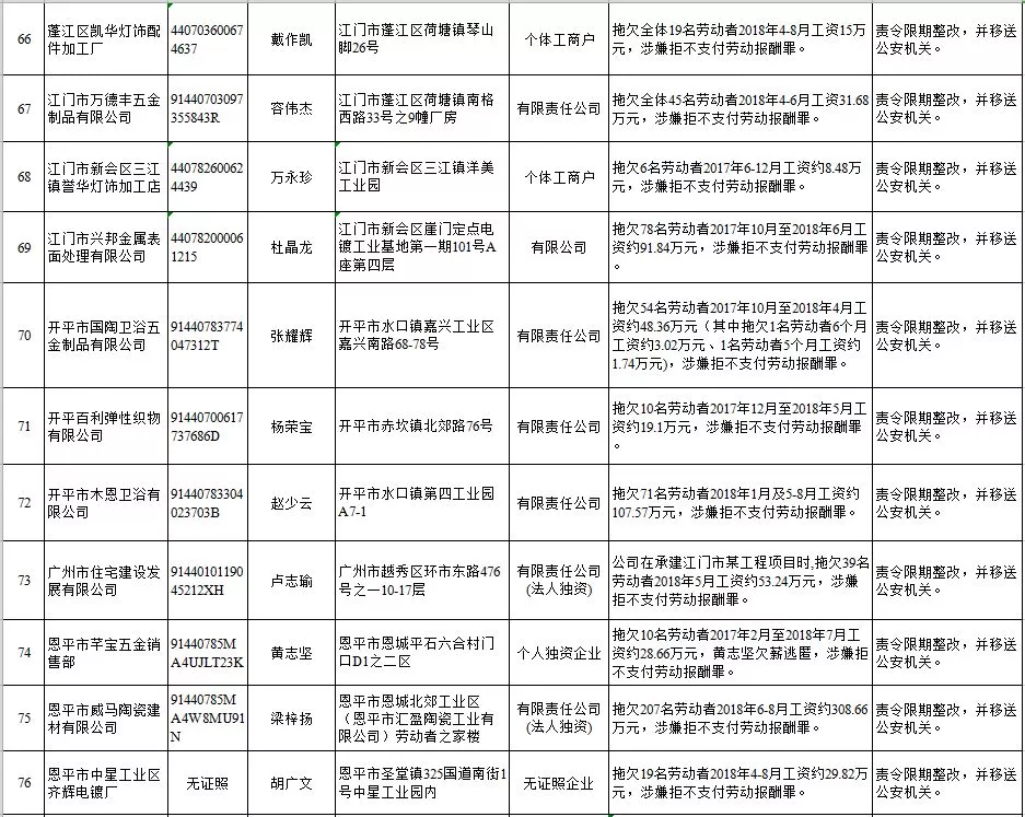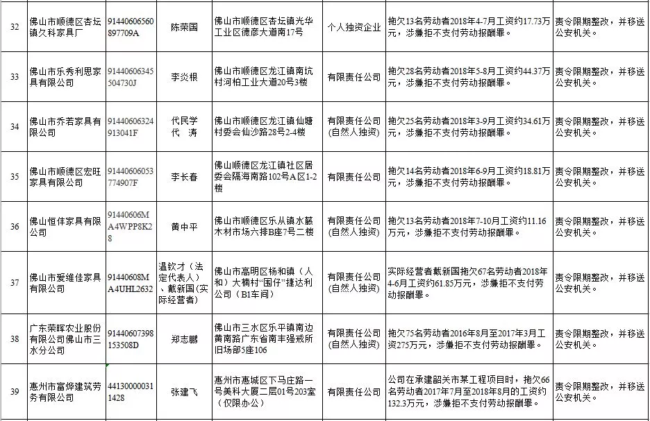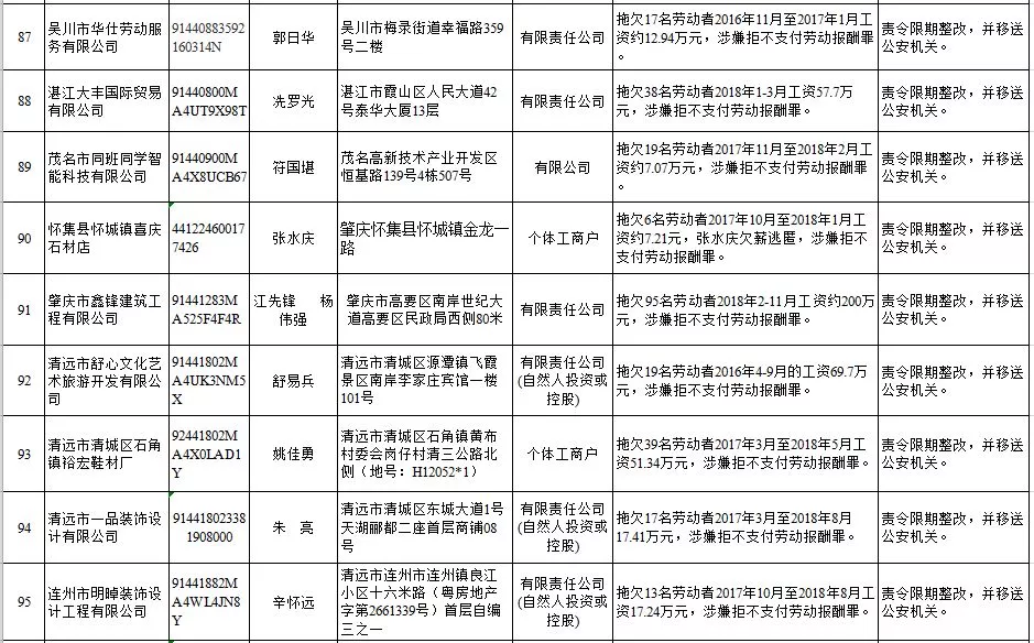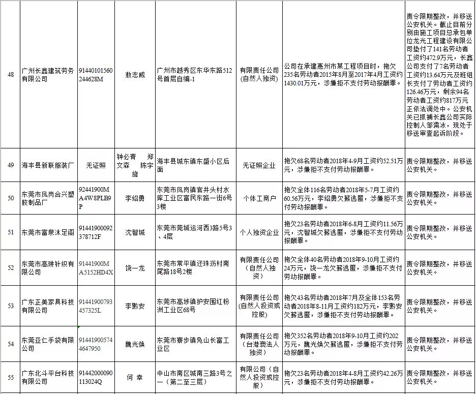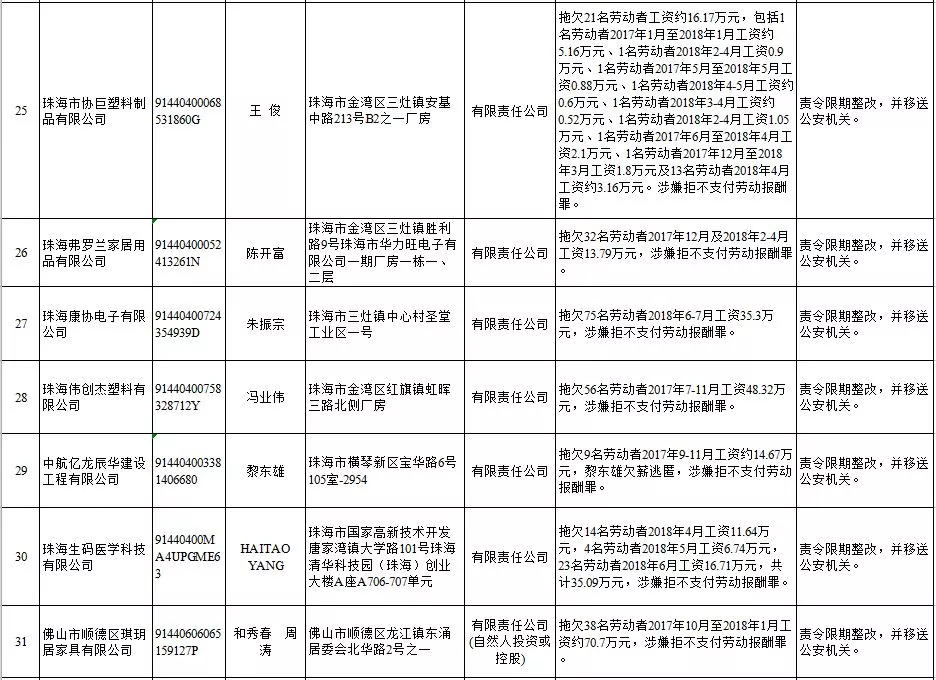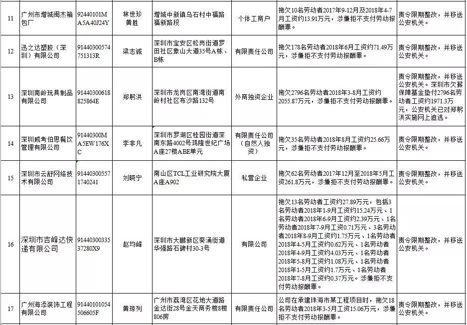 深圳新聞網(wǎng)2019年1月29日訊 (記者 劉婷)據(jù)廣東發(fā)布消息,省人社廳近日公布,2019年第一批用人單位重大勞動(dòng)保障違法行為名單。到底是哪些企業(yè)在惡意欠薪?這些“老賴”企業(yè)的營業(yè)執(zhí)照、地址、法人等等超全信息都在這!