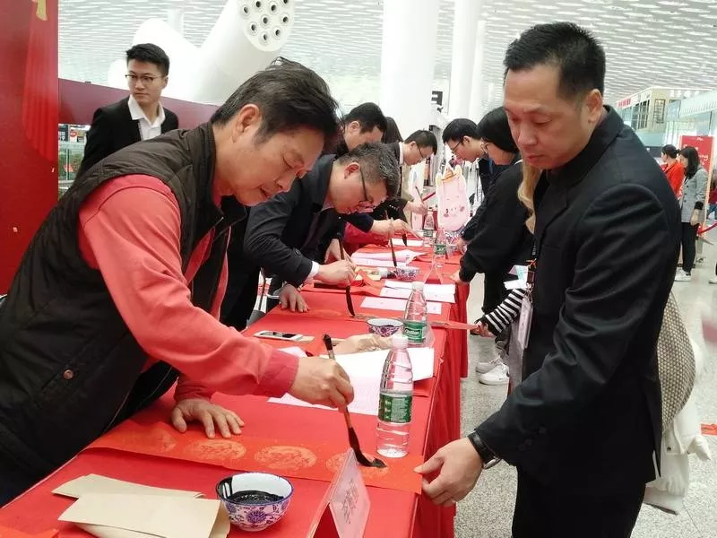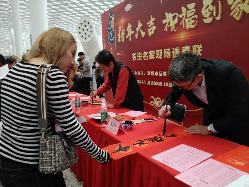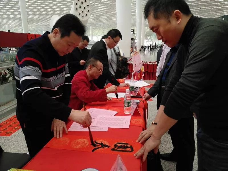 寶安區(qū)書法家協(xié)會(huì)主席李高揚(yáng)介紹,在機(jī)場(chǎng)送春聯(lián)很有意義,可以給全國(guó)各地的朋友們送上新年祝福。這次深圳發(fā)布廳攜手深圳機(jī)場(chǎng)舉辦活動(dòng),寶安區(qū)書法家協(xié)會(huì)集結(jié)高手出動(dòng)為群眾服務(wù),為市民送去祝福。他祝大家新春快樂(lè),闔家幸福。