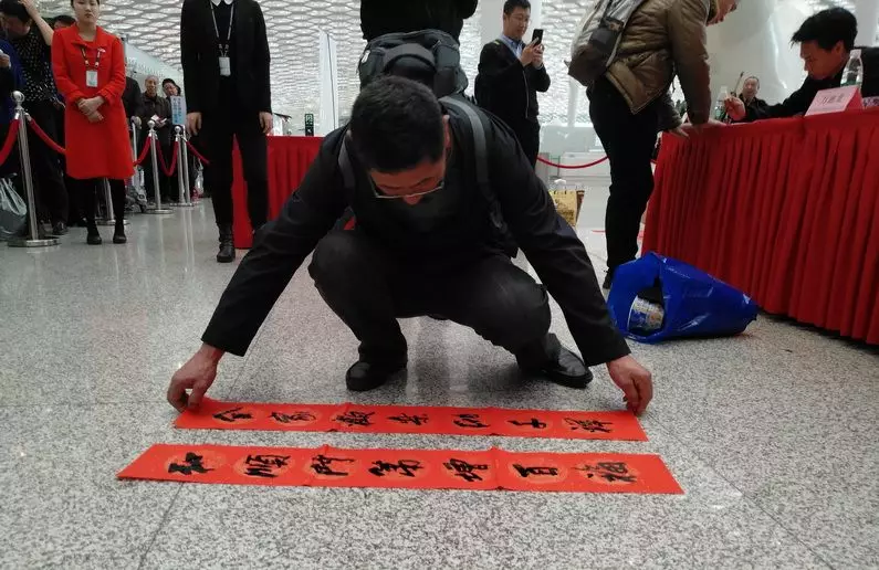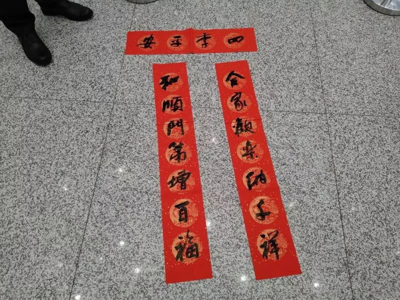 來自山東的譚先生剛從越南河內(nèi)務工回來,準備轉(zhuǎn)機回山東煙臺,他選擇了“合家歡樂納千祥,和順門第增百?!?表達了他對家庭美滿的祝福。