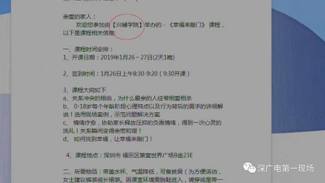 深廣電第一現(xiàn)場(chǎng)2019年2月1日訊 寒假前夕,龍華區(qū)不少家長(zhǎng)向我們欄目反映,從上學(xué)期開始他們通過學(xué)校老師的介紹,接觸到了一個(gè)教育機(jī)構(gòu)。這個(gè)校外的培訓(xùn)機(jī)構(gòu),主要給家長(zhǎng)傳授親子教育和家庭相處的技巧,按說這應(yīng)該是一件好事,可是一些家長(zhǎng)卻發(fā)現(xiàn),參加了一些課程之后,不光家庭關(guān)系沒有變好,反而帶來了不少家庭矛盾?