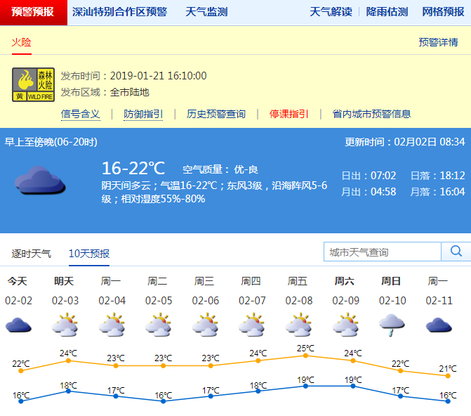 深圳氣象局預計2019-02-03: 多云,早晚有輕霧 氣溫: 18-24 2019-02-04: 陰天間多云,有零星小雨,早晚有輕霧或霧 氣溫: 17-23 2019-02-05: 陰天間多云,有零星小雨 氣溫: 16-22 2019-02-06: 多云,早晚有輕霧 氣溫: 17-23 2019-02-07: 多云,早晚有輕霧或霧 氣溫: 18-24 2019-02-08: 多云,偶有零星小雨,早晚有輕霧 氣溫: 19-25 2019-02-09: 多云,偶有零星小雨,早晚有輕霧 氣溫: 19-24 2019-02-10: 陰天有小雨 氣溫: 17-22 2019-02-11: 陰天,有零星小雨 氣溫: 16-21