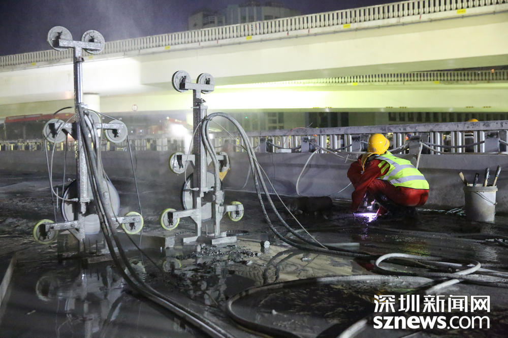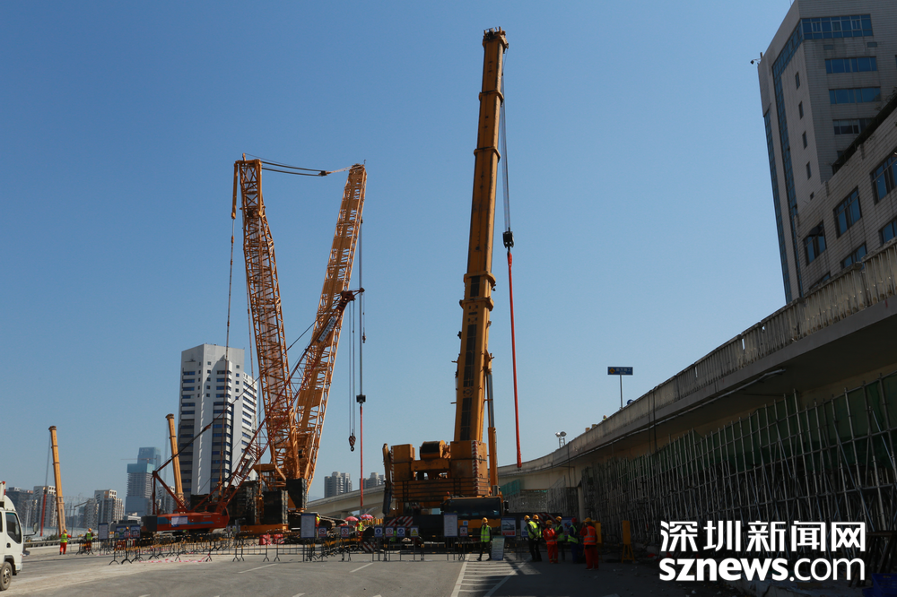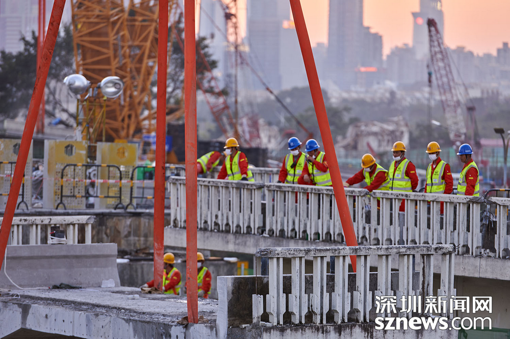 深圳新聞網(wǎng)2019年2月3日訊(記者 黃賢娟 趙穎致 黃婉婷 胡志方 林婉婷)與日漸冷清下來的街道商鋪不同,春節(jié)前夕的黃木崗立交仍是一片繁忙景象。這是2月2日傍晚,數(shù)百名身穿橙黃馬甲的工人正在忙著將立交橋切割分離。平板車、模塊車往來穿梭,將一塊塊拆卸下來的橋體陸續(xù)運(yùn)走。夕陽西下,橙黃色工服反射出點(diǎn)點(diǎn)熒光,成為安靜的城市中獨(dú)特的點(diǎn)綴。