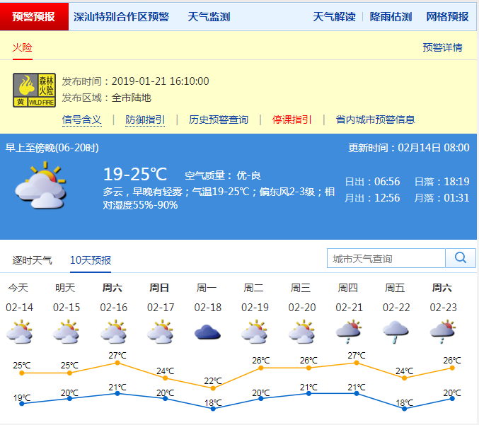 記者從深圳市氣象局了解到,14日深圳全市多云為主,氣溫19-25℃,相對濕度70%-90%,偏東風2-3級,能見度8-18公里。值得一提的是,今天距離深圳平均入冬日:1月13日已經(jīng)過去一個月了,今年直接入夏的可能性越來越大。