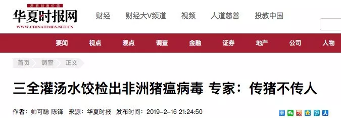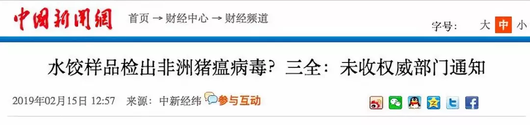 據(jù)紅星新聞報(bào)道,多家媒體稱(chēng),2月9日,湖南省湘西自治州重大動(dòng)物疫病防制指揮部辦公室接到省防治重大動(dòng)物疫病指揮部辦公室通知,要求瀘溪縣重大動(dòng)物疫病防制指揮部辦公室對(duì)來(lái)源于吉首市凌云冷凍食品批發(fā)部?jī)鰩?kù)的產(chǎn)品進(jìn)行抽樣,在瀘溪縣好又多和萬(wàn)家福兩家超市共抽取4個(gè)批次12份樣品,經(jīng)州動(dòng)物疫病預(yù)防控制中心檢測(cè),其中由河南三全食品有限公司生產(chǎn)批次為20190113H的“三全灌湯水餃”3份樣品為非洲豬瘟病毒核酸陽(yáng)性。