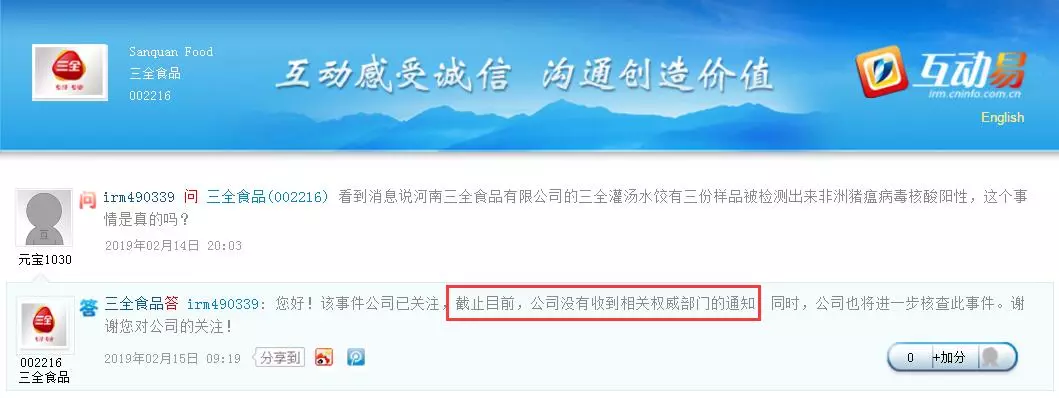 中新經(jīng)緯客戶端報(bào)道,14日晚間,有投資者在深交所互動(dòng)平臺(tái)上提問(wèn)三全食品稱(chēng),有消息稱(chēng)三全灌湯水餃有三份樣品被檢測(cè)出非洲豬瘟病毒核酸陽(yáng)性,該事件是否真實(shí)?