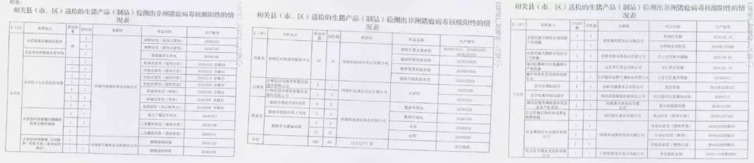 除速凍食品外,該網(wǎng)友發(fā)帖顯示,標(biāo)稱(chēng)河南省長(zhǎng)隆食品有限責(zé)任公司、濟(jì)南康利斯食品有限公司、山東齊匯食品有限公司、山東臨沂金鑼文瑞食品有限公司、河南惠萬(wàn)家食品有限公司、合肥市凱樂(lè)斯食品有限公司生產(chǎn)的培根、香腸、火腿腸等個(gè)別批次產(chǎn)品樣品,也被檢出非洲豬瘟病毒核酸陽(yáng)性。