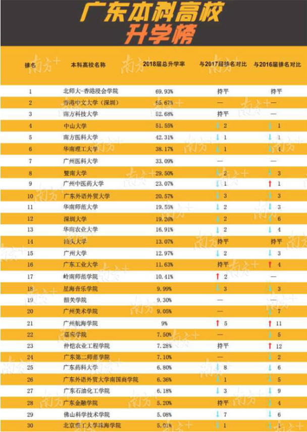 在發(fā)布“薪酬榜”后(點擊查看“薪酬榜”),今天南方教育智庫繼續(xù)獨家推出廣東高?!吧龑W榜”,梳理全省123所高校發(fā)布的《2018年畢業(yè)生就業(yè)質(zhì)量年度報告》的關鍵數(shù)據(jù),聚焦畢業(yè)生的深造路徑和升學比例。其中南方醫(yī)科大學、中山大學、廣州醫(yī)科大學本科畢業(yè)生國內(nèi)升學率位列前3名,均超過33%。