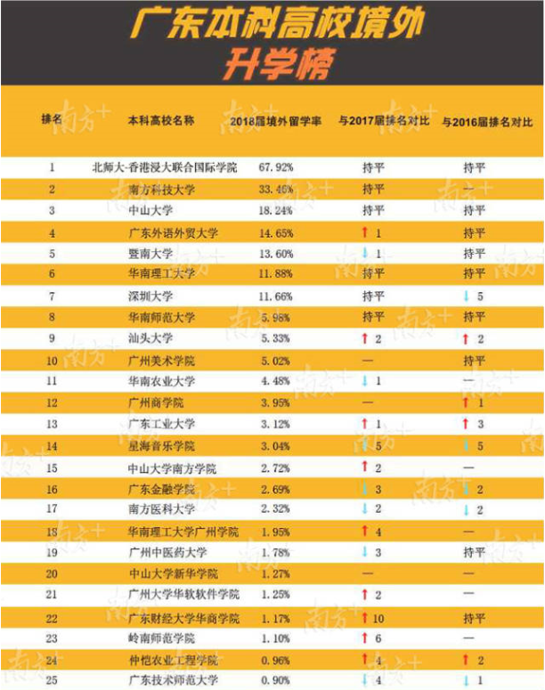 廣東外語外貿(mào)大學境外留學人數(shù)顯著提升,2018屆共有275人升入世界排名前100名的高校深造。兩所內(nèi)地與香港合作創(chuàng)辦的大學在境外留學率上處于全省前列。北京師范大學-香港浸會大學聯(lián)合國際學院持續(xù)多年保持全省第1位,此次共有811人留學,其中481人就讀世界前100名的大學。香港中文大學(深圳)僅公布總升學率65.67%,該校就業(yè)處相關負責人介紹,升學率中絕大部分是境外留學,176名學生平均每人收到3份世界知名大學錄取通知書。