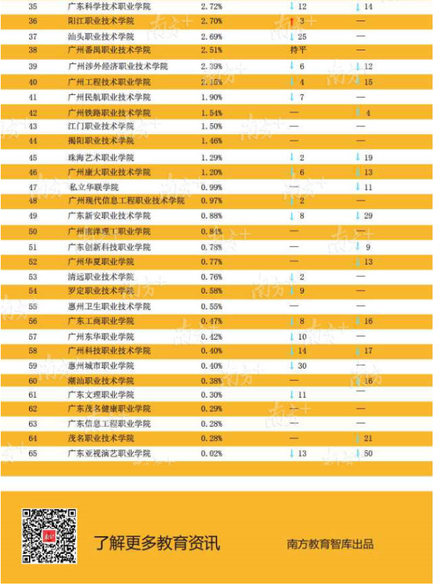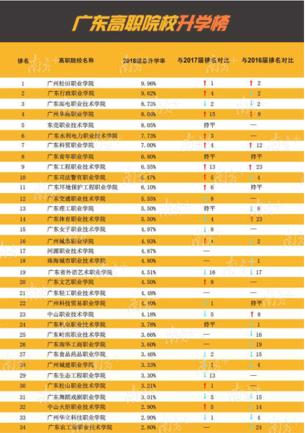 近3年各高職升學數(shù)據(jù)顯示,越來越多畢業(yè)生通過升學提升自身競爭力,尤其2018屆升學率增長明顯。其中有7所高職院校的畢業(yè)生升學率達到或超過7%,分別是廣州松田職業(yè)學院9.96%、廣東行政職業(yè)學院9.62%、廣東郵電職業(yè)技術學院8.73%、廣州華商職業(yè)學院8.06%、東莞職業(yè)技術學院8.05%、廣東水利電力職業(yè)技術學院7.73%和廣東科貿(mào)職業(yè)學院7.00%。