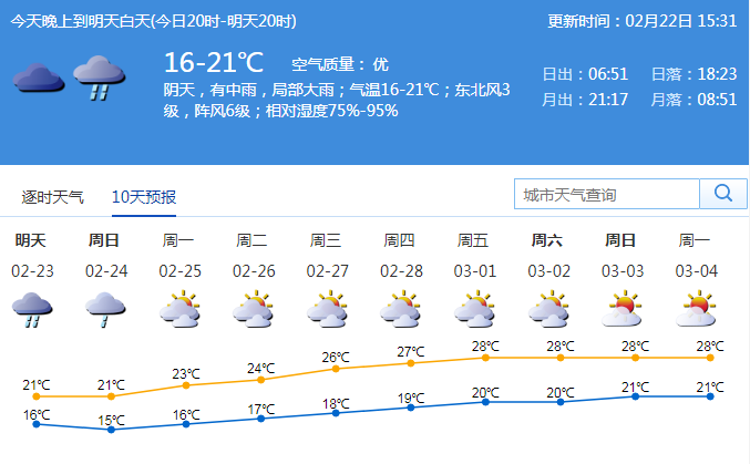 市氣象局預(yù)計(jì),23-24日,深圳市有中雨局部大雨,可能伴有雷暴,降雨時(shí)段主要出現(xiàn)在23日白天到24日上午,沿海和高地有7級(jí)偏東陣風(fēng);23日氣溫在16-21℃;東北風(fēng)3級(jí);相對(duì)濕度75%-95%;25日起多云可見(jiàn)陽(yáng)光,天氣溫暖。