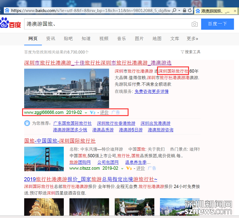 深圳市消委會模擬消費(fèi)者網(wǎng)絡(luò)搜索實(shí)際使用場景,在百度搜索中搜索“港澳游國旅”等關(guān)鍵詞,進(jìn)行了專項(xiàng)測試調(diào)查。調(diào)查發(fā)現(xiàn),搜素“港澳游國旅”等關(guān)鍵詞時搜索頁面會出現(xiàn)加V等級認(rèn)證的旅行社廣告信息,但經(jīng)核實(shí),“深圳信用網(wǎng)”商事主體登記信息中并無該企業(yè)。