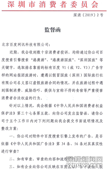 “野馬”旅行社屢禁不絕、愈演愈烈,不僅嚴(yán)重傷害了廣大消費(fèi)者,傷害了合法企業(yè)的正當(dāng)經(jīng)營,傷害了公平有序的市場競爭秩序,也傷害了深圳的城市形象,這其中,百度難辭其咎。一些不法分子利用百度信譽(yù)V認(rèn)證的核查漏洞和競價排名規(guī)則,把百度作為招徠客源的廣告投放平臺,對消費(fèi)者起到了極強(qiáng)的誤導(dǎo)作用。在此,深圳市消委會“三問百度”:
