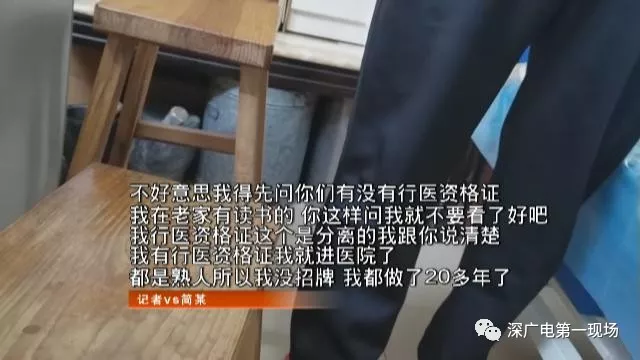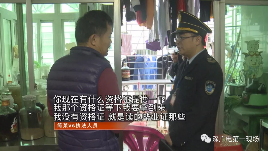 簡(jiǎn)某嘴上說(shuō)他有醫(yī)學(xué)院畢業(yè)證,但最后出示的是20多年前取得的,《廣州市社會(huì)力量辦各類校班結(jié)業(yè)證書》及《中醫(yī)醫(yī)療函授學(xué)習(xí)證書》,衛(wèi)監(jiān)人員說(shuō)這都不算醫(yī)師執(zhí)業(yè)資格。對(duì)于沒有資格證的問題,簡(jiǎn)某表示自己曾經(jīng)咨詢過,原來(lái)可以到湛江進(jìn)行考試,但現(xiàn)在已經(jīng)不行了。