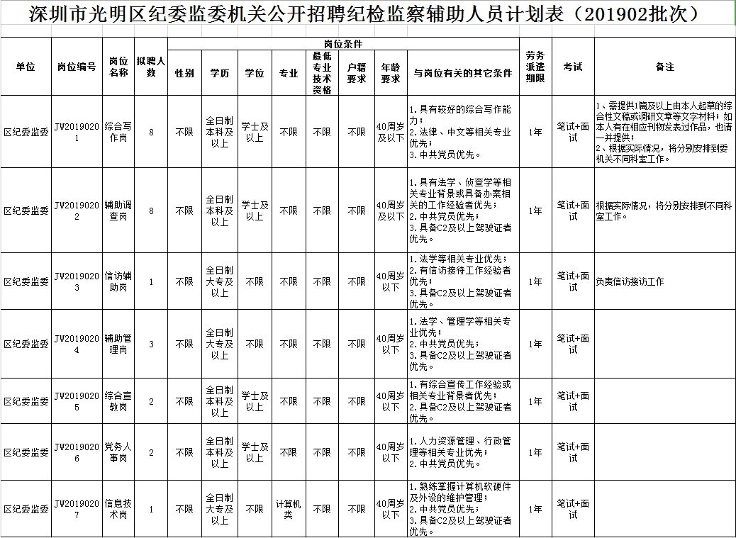 深圳市光明區(qū)紀(jì)委監(jiān)委機(jī)關(guān)公開招聘紀(jì)檢監(jiān)察輔助人員計(jì)劃表(201902批次)