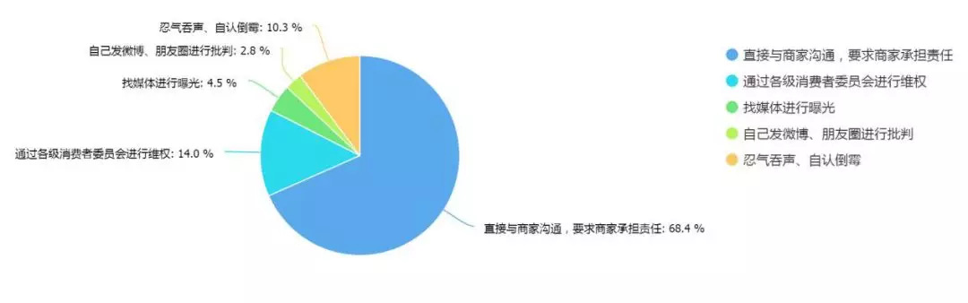 有68.4%的受訪(fǎng)者在遇到消費(fèi)侵權(quán)后選擇直接與商家溝通,要求商家承擔(dān)責(zé)任,10.4%的受訪(fǎng)者會(huì)選擇忍氣吞聲、自認(rèn)倒霉;其中男性消費(fèi)者更傾向于找媒體曝光,而女性消費(fèi)者則傾向于忍氣吞聲。