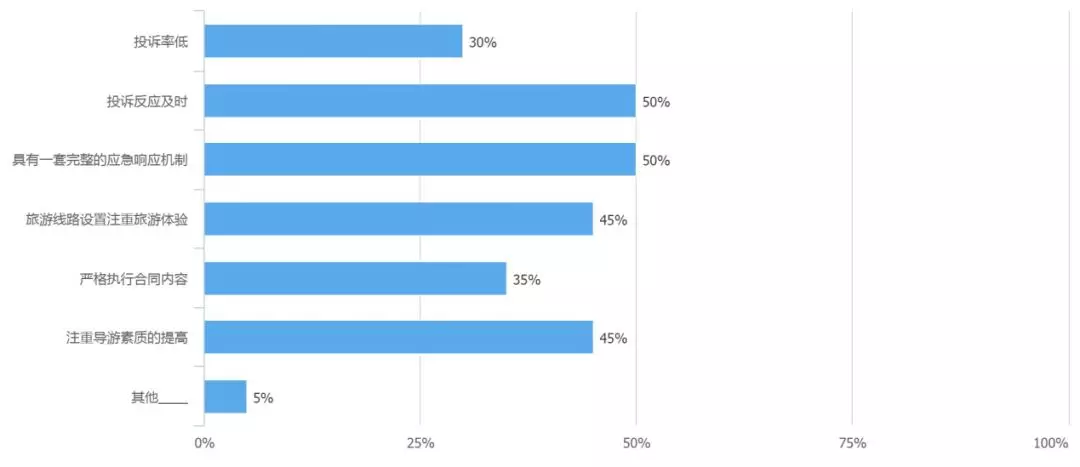 在眾多的旅游體驗當(dāng)中,消費者遇到的最主要的問題是強制購物、遭遇虛假宣傳、臨時更改旅游線路等問題,同時消費者在選擇旅游線路時,“野馬旅行社”、導(dǎo)游的服務(wù)態(tài)度、安全等問題也在重點考慮范圍內(nèi)。在改進旅行社服務(wù)質(zhì)量方面,80%的消費者認為現(xiàn)狀需要政府和網(wǎng)絡(luò)共同關(guān)注,才能營造良好的旅游環(huán)境。旅行社對于投訴案例的反應(yīng)機制和反應(yīng)速度,之后也將成為消費者在選擇旅行線路時的重要考量標(biāo)準(zhǔn)之一。