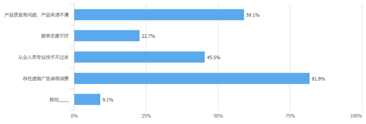 消費者們認為美容美發(fā)行業(yè)中存在最大的問題是虛假廣告誤導(dǎo)消費,第二則是產(chǎn)品質(zhì)量問題和產(chǎn)品來源不清。(常軍平/鄭媛/姚苑/田晨夕/曹園芳/田志強/潘寶儀)