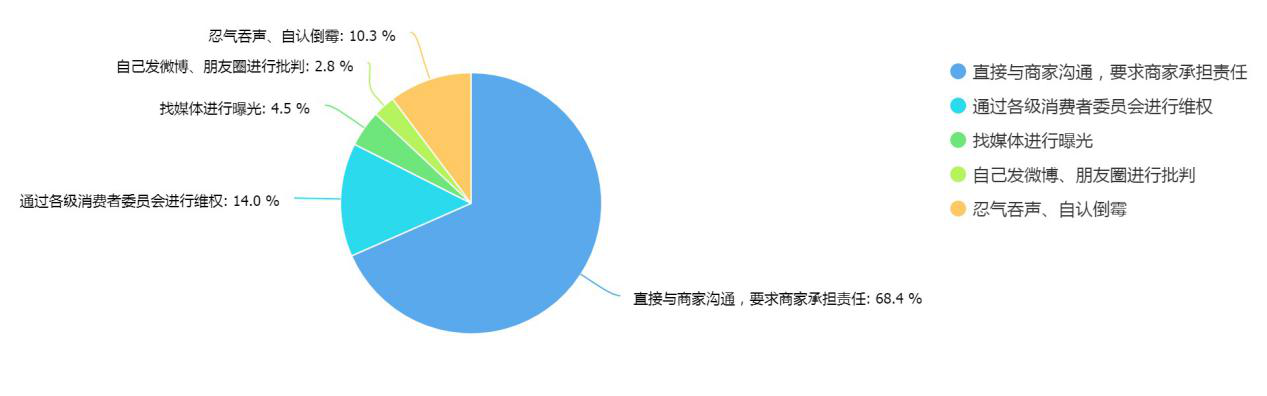 有68.4%的受訪者在遇到消費侵權(quán)后選擇直接與商家溝通,要求商家承擔(dān)責(zé)任,10.4%的受訪者會選擇忍氣吞聲、自認倒霉;其中男性消費者更傾向于找媒體曝光,而女性消費者則傾向于忍氣吞聲。