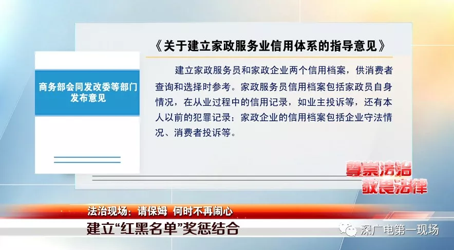 趙坤:在深圳,請(qǐng)保姆,育嬰師,鐘點(diǎn)工等等是很多家庭的剛需,但是很多人也抱怨說(shuō),要請(qǐng)個(gè)好的保姆阿姨實(shí)在是太難了,有些雇主因?yàn)楦鞣N原因家里來(lái)來(lái)去去換了好幾個(gè)阿姨,有些甚至還跟家政公司調(diào)解不成鬧上了法庭。防患于未然,商務(wù)部等部委這次發(fā)布的意見(jiàn),建立信用檔案,可謂來(lái)的正當(dāng)時(shí)。我們也期待深圳能盡快出臺(tái)家政行業(yè)信用平臺(tái),期待深圳的家政行業(yè)能更加透明,更加規(guī)范。
