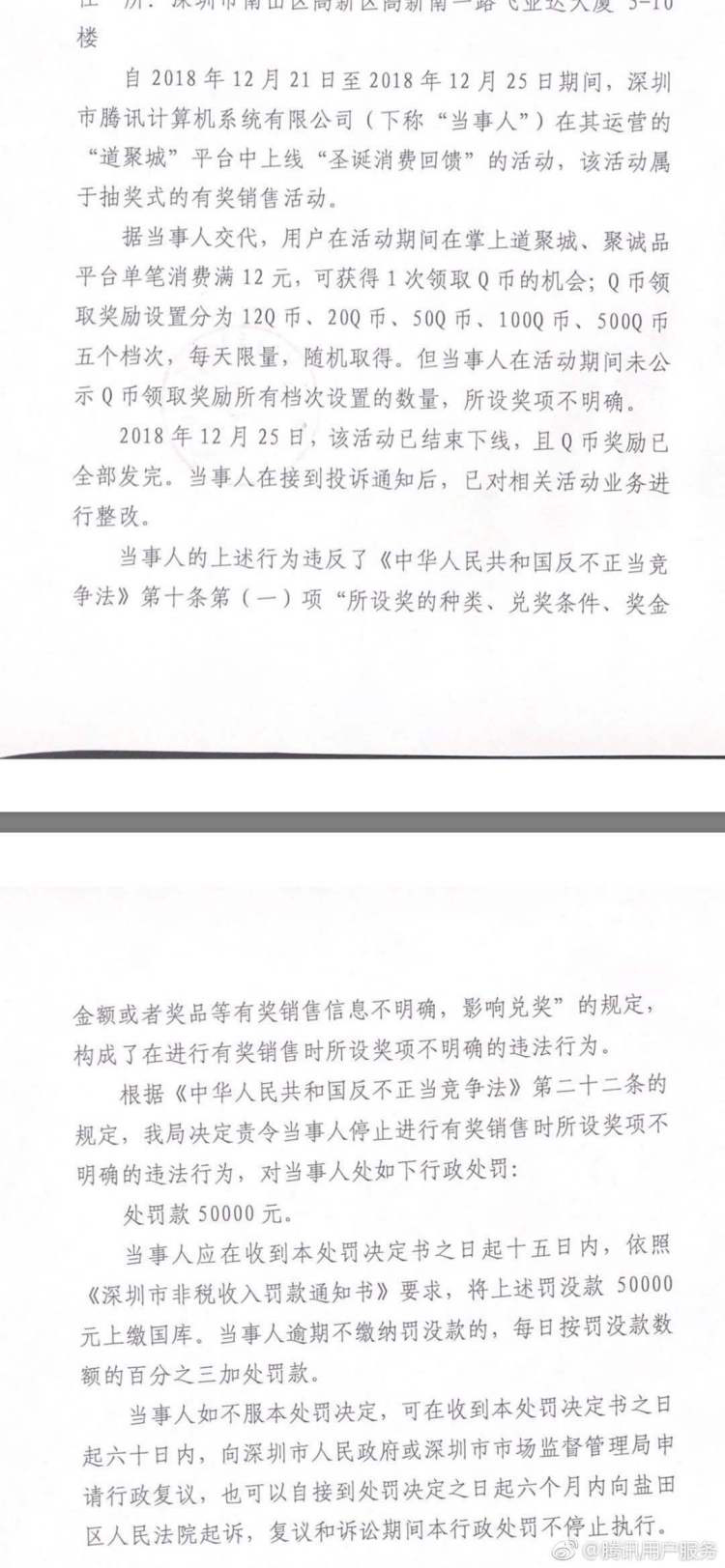 為解答網(wǎng)友疑惑,當天晚間,微博賬號騰訊用戶服務(wù)公開發(fā)布了該處罰決定書,決定書中提到,2018年12月21日 -25日期間,深圳市騰訊計算機系統(tǒng)有限公司(下稱"當事人")在其運營的"道聚城"平臺中上線"圣誕消費回饋"的活動,該活動屬于抽獎式的有獎銷售活動。