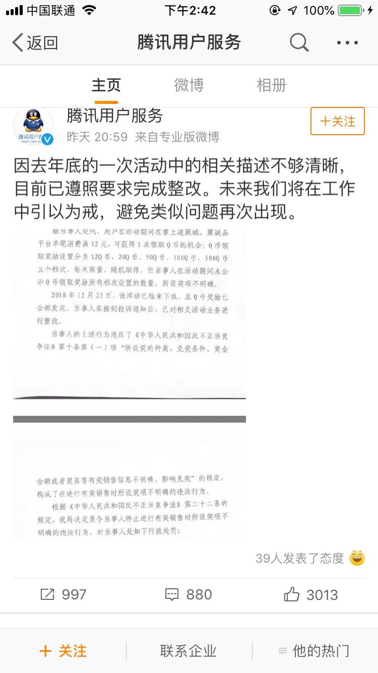 3月20日,微博認證為騰訊公司公關(guān)總監(jiān)張軍在微博中解釋:因去年年底的一次活動中的相關(guān)描述不夠清晰,目前已遵照要求完成整改。未來我們將在工作中引以為戒,避免類似問題再次出現(xiàn)。