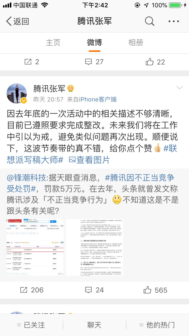 數(shù)據(jù)顯示,騰訊在前兩次受到行政處罰的類型均為不正當競爭。微博賬號 @鋒潮科技發(fā)文稱,去年,今日頭條就曾發(fā)文稱騰訊設(shè)計不正當競爭行為,不知道這是不是跟頭條有關(guān)。對該揣測,張軍還在微博中調(diào)侃工作人員不早公布緣由,導(dǎo)致該事件被人帶節(jié)奏。