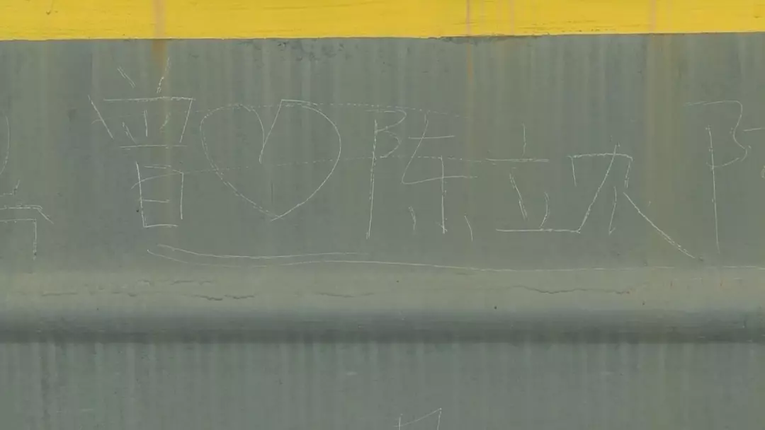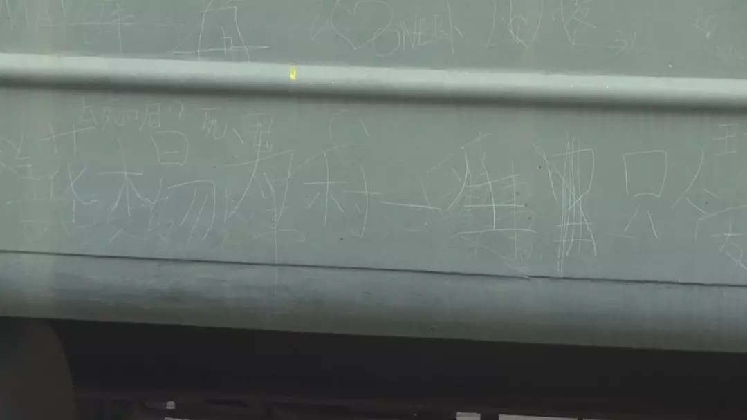 今天中午,記者來到現(xiàn)場,看見兩節(jié)火車的車廂上都有多處被不文明涂寫的痕跡。有些痕跡是用手指直接涂寫的,有些則是用尖利器物刻寫。內(nèi)容大都是刻上名字,表達愛意,到此一游,甚至是寫詩。