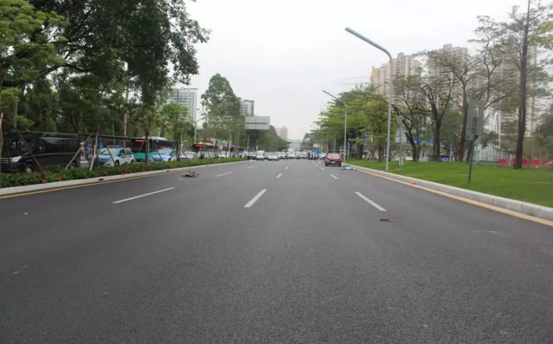 案發(fā)現(xiàn)場位于寶安區(qū)寶安大道新安街道中糧卡羅社區(qū)路段,南往北主道路寬13.72米,該路段設(shè)立有輔道及非機(jī)動車道。瀝青路面,照明條件為白天,交通信號方式為標(biāo)志、標(biāo)線。