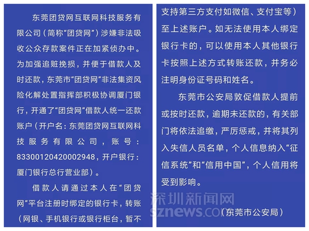 4月2日,東莞市公安局發(fā)布情況通報(bào)稱,公安機(jī)關(guān)正在加緊偵辦“團(tuán)貸網(wǎng)”涉嫌非法吸收公眾存款案件。東莞警方開設(shè)了借款人統(tǒng)一還款賬戶,敦促借款人提前或按時(shí)還款,否則將依法追繳,嚴(yán)厲懲戒,并列入失信人員名單。