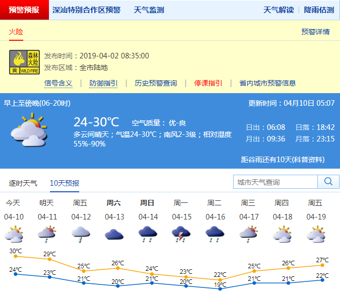 深圳新聞網(wǎng)2019年4月10日訊 超過(guò)30℃!深圳昨日氣溫創(chuàng)下2019年以來(lái)最高。記者從深圳市氣象局了解到,今日深圳市以多云間晴天天氣為主;氣溫在24-30℃;南風(fēng)2-3級(jí);相對(duì)濕度55%-90%。