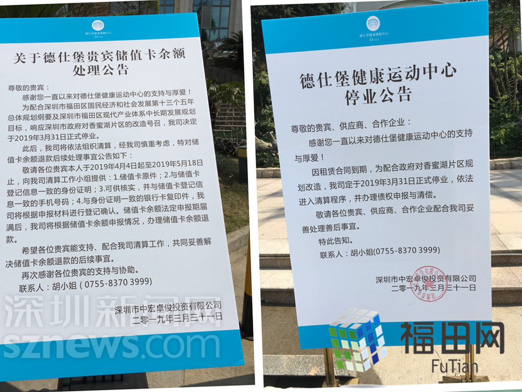 公告牌顯示,因租賃合同到期,為配合政府對香蜜湖片區(qū)規(guī)劃改造,德仕堡健康運(yùn)動中心定于2019年3月31日正式停業(yè)。