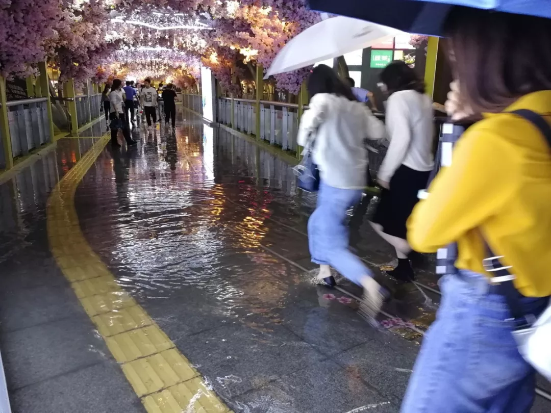 ▲地鐵口一路踩水坑回家的市民(記者邱曉潔攝)