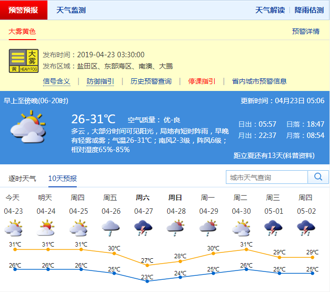 深圳新聞網2019年4月23日訊 深圳市氣象局預計23日多云,大部分時間可見陽光,中午前后天氣悶熱,局地有短時陣雨,早晚有輕霧或霧;25-31℃;輕微南風;濕度65%-85%。24-25日多云局地有短時陣雨,中午較熱;26日起天氣趨于不穩(wěn)定。