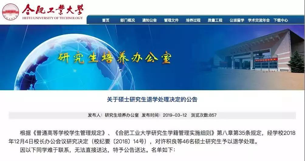 對46名碩士研究生予以退學(xué)處理,因其在學(xué)校規(guī)定的最長學(xué)習(xí)年限內(nèi)未完成學(xué)業(yè),或超過學(xué)校規(guī)定期限未注冊而又無正當理由,且未經(jīng)請假離校連續(xù)兩周未參加學(xué)校的教學(xué)活動。