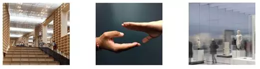 在外部觀看這兩座建筑,像是上下合并的雙手,在兩座建筑中間創(chuàng)造出了不同層次的公共平臺,南側(cè)入口廣場拾級而上進(jìn)入到第二圖書館前的廣場,其上預(yù)留豐富的空間意向,圖書市場、閱讀、散步、展覽、演講……而這個廣場又與美術(shù)館前的地面庭院巧妙相連,在大雨蓬的覆蓋下,是美術(shù)館的戶外雕塑廣場;它們?yōu)槌鞘刑峁┝斯部臻g并承接著城市的軸線。平臺擴(kuò)充了建筑的功能,抬高的空間使它遠(yuǎn)離城市的喧囂,其上懸挑的屋蓋為其提供了庇護(hù),營造出了舒適的氛圍。